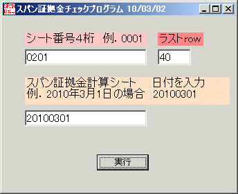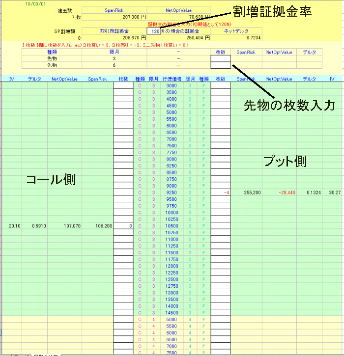 | ■225オプションソフトとの連携について 「Myストラテジー」に入力されている建玉を、手入力で1つ1つ入れるのは面倒くさい。その場合は、[spanchk.exe]を使います。 ※弊社サイトにアップ済み 前提条件として、[spanchk.exe]と毎日のスパン証拠金計算シートが同じフォルダにないと動きません。 よく分からない方は、デスクトップ上に両ファイルを保存しておきます。 [spanchk.exe]の起動 ![]() シート番号には、「Myストラテジー」から作成済みのシートを入力します。 例だと201番です。 ラストrowの項目は、「Myストラテジー」のシートの何番目まで使っているかを入力します。 ピッタリな行数ではなく、10ほど余裕をみて入力しておくと、建玉が増えた場合でも毎回入力する必要はなくなります。 例だと40行目までを証拠金シートに登録する、という意味合いです。 もし、「Myストラテジー」のシートが50行目までを使っているとすると、41−50行目までがスパン証拠金シートに反映されませんでご注意ください。 スパン証拠金計算シートの日付欄の入力は、例のように西暦8桁を続けて入力してください。 ここまで出来たら「実行」をクリックします。 しばらくすると、証拠金シートに建玉がセットされていきます。 ※瞬時にセットされるわけではありません。 シート左下に注目してみると、下記のように進行状況が表示されています。 ![]() 結果、こうなります。翌限月分がある場合は、シートを下へスクロールさせていけば出てきます。 ![]() 下へスクロール ![]() ※建玉が少ない場合は、直接スパン証拠金シートに手入力したほうがはやいです。建玉が多い方は、ご利用ください。 |