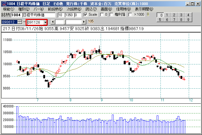 | ■ドバイショック当日 11/27 日経平均は一気に下放れ。9000円割れ目前です。 ![]() オプション価格表 8000プットは35円にはね上がりました。 ![]() |