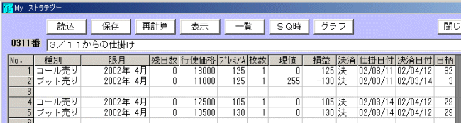 - 3月のSQ、すなわち3月8日の先物の終値は11900円でしたので、上に1000円はなれているコール(13000円)と下に1000円はなれているプット(11000円)を同時に翌週(3月11)に売ります。