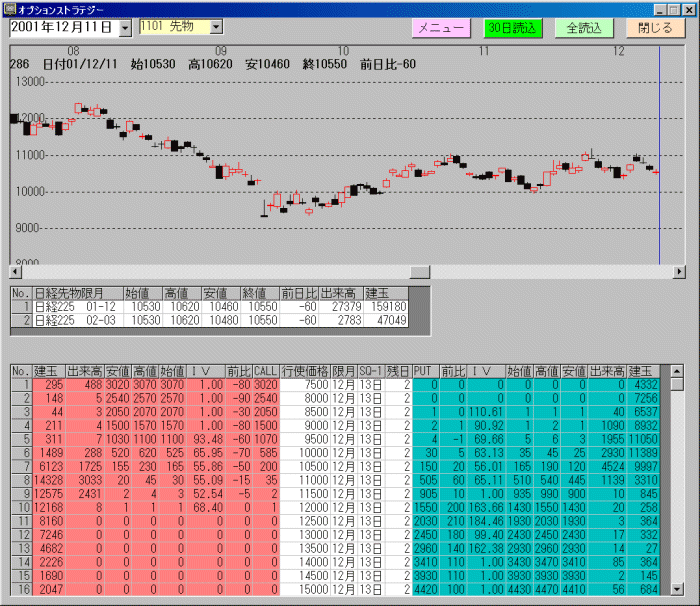 本日のオプション価格をみると行使価格10000円のプットは30円、11000円コ−ルは35円となっています。欲をかかずに2日間で65円を取りに行きたいと思います。
