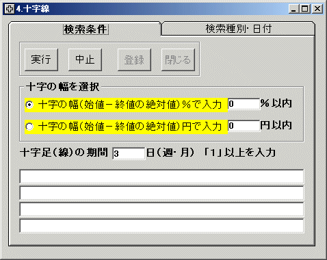 十字の条件として通常は「始値=終値」ですが、本検索ではそのほかに十字の幅を%設定したり、値幅設定したりする事が出来ます。